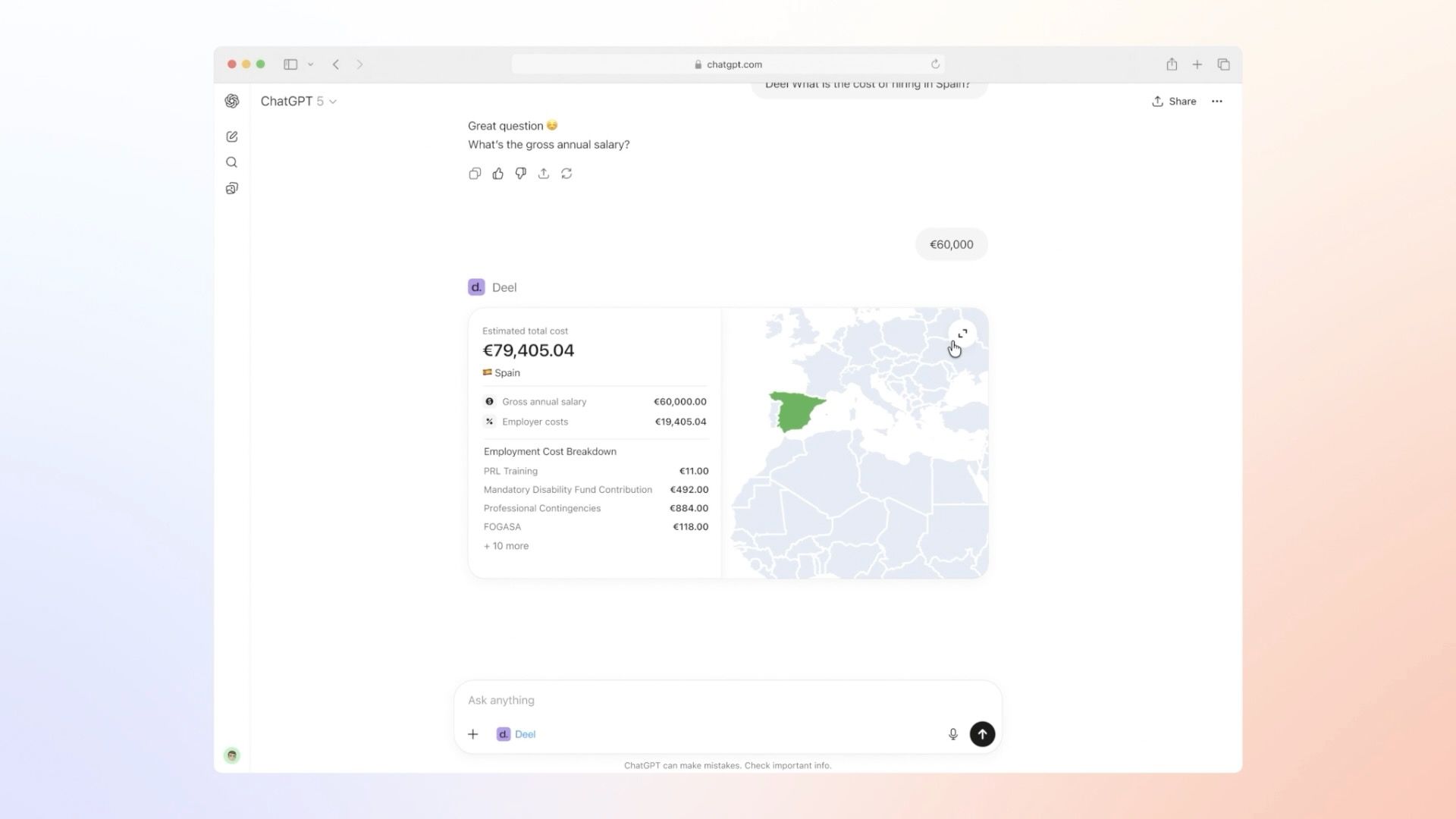 The app is now open to anyone, right inside ChatGPT. And if you're already a Deel customer or paid through Deel, you can connect your account to do even more and manage contracts, onboarding, check your pay, and review time-off approvals, all from chat.