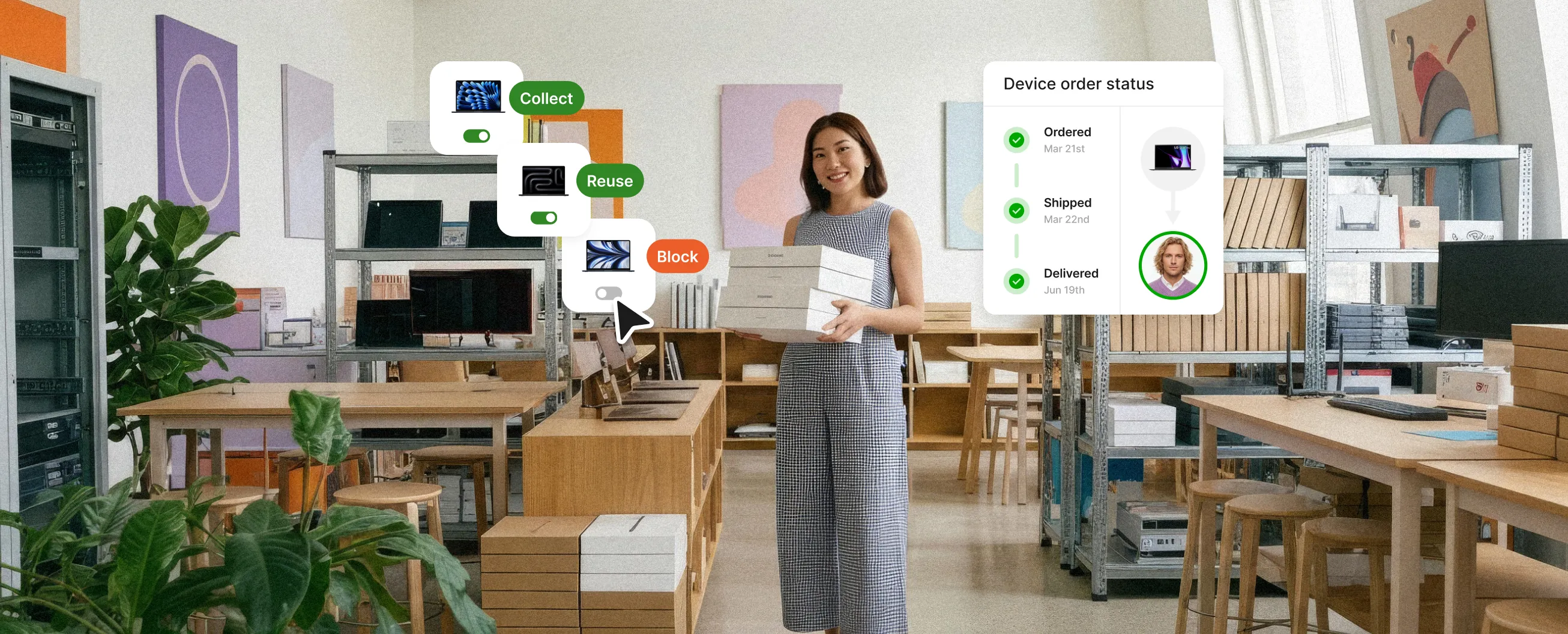 デバイスはグローバルに出荷され、アプリやセキュリティが事前に設定され、開始日に合わせて調整されています。従業員は、どこで採用されても初日から働くために必要なすべてを受け取ります。