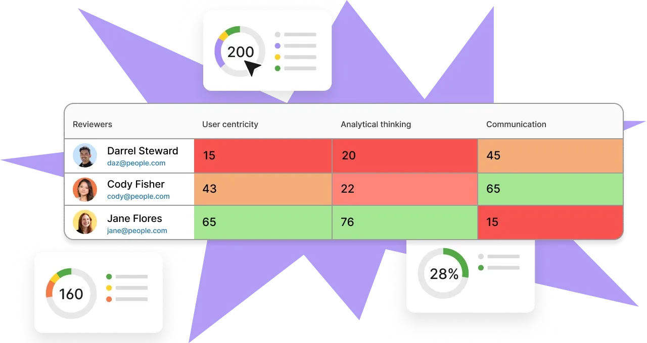 - Performance reviews: Run structured 360° cycles with self, peer, manager, and upward feedback, with automated reminders and real-time progress tracking