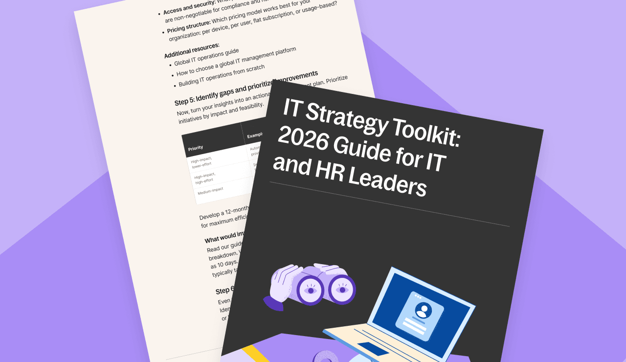 This IT Strategy Toolkit helps you build modern, scalable IT operations for distributed teams. It's a practical guide to evaluating your current setup, identifying automation opportunities, and creating a roadmap for 2026.